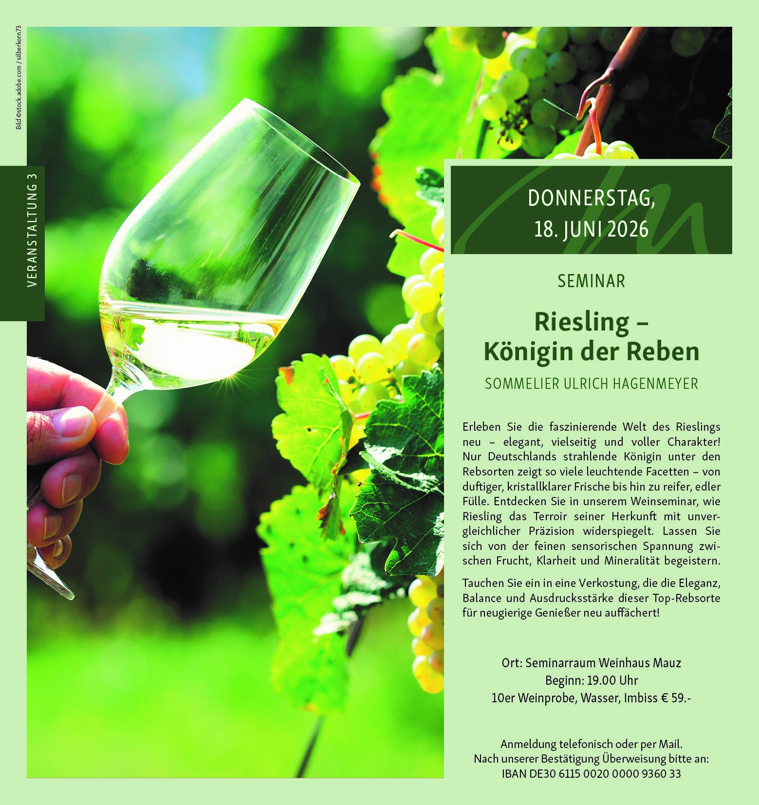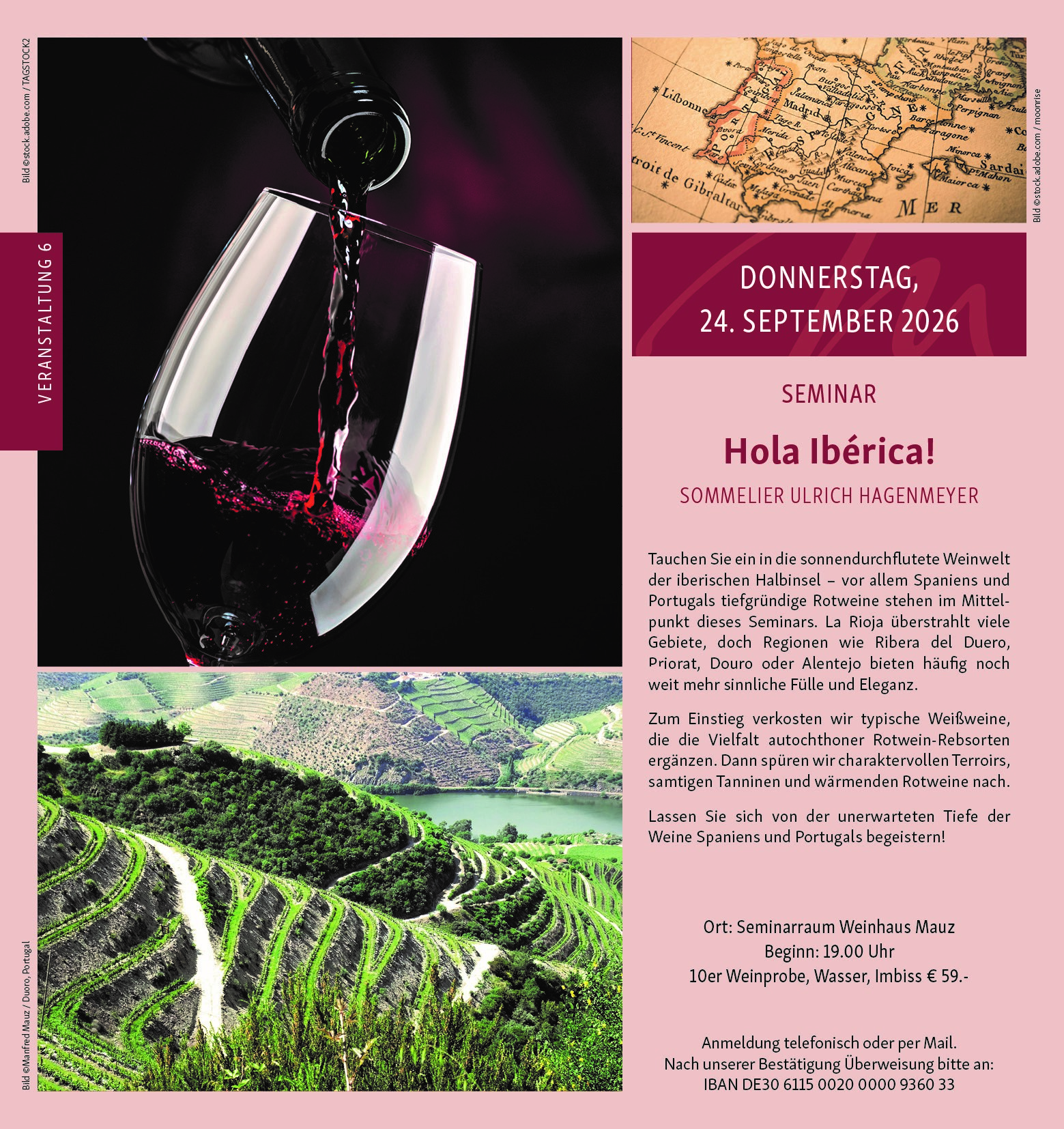 Kosten: 59€ (10er Weinprobe, Wasser, Imbiss)