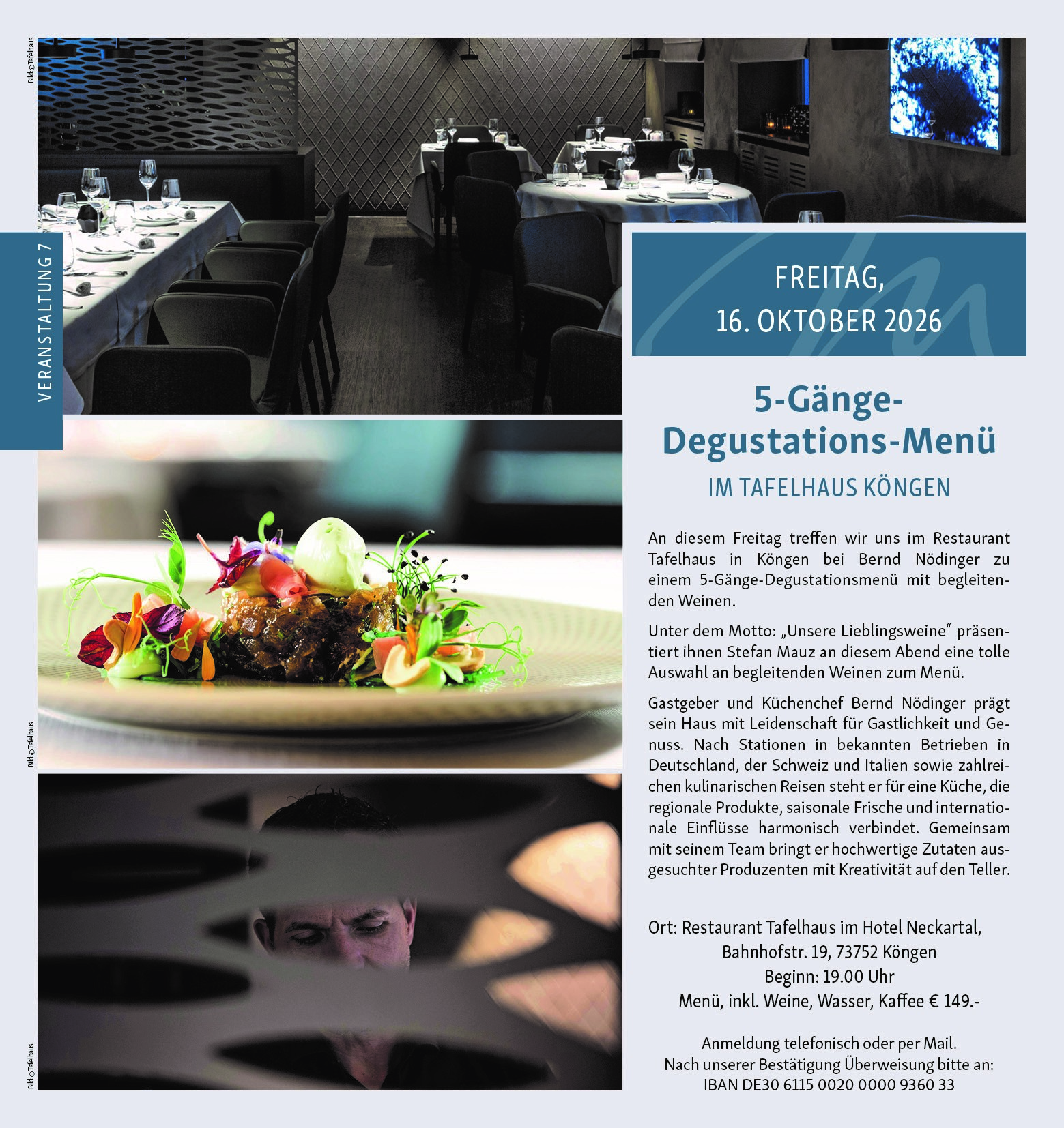 Kosten: 149,-€ ( Menü inklusive Wein, Wasser, Kaffee)